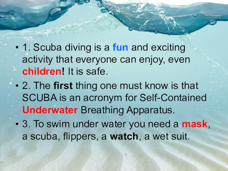 2. The first thing one must know is that SCUBA is an acronym for Self-Contained Underwater Breathing Apparatus.
