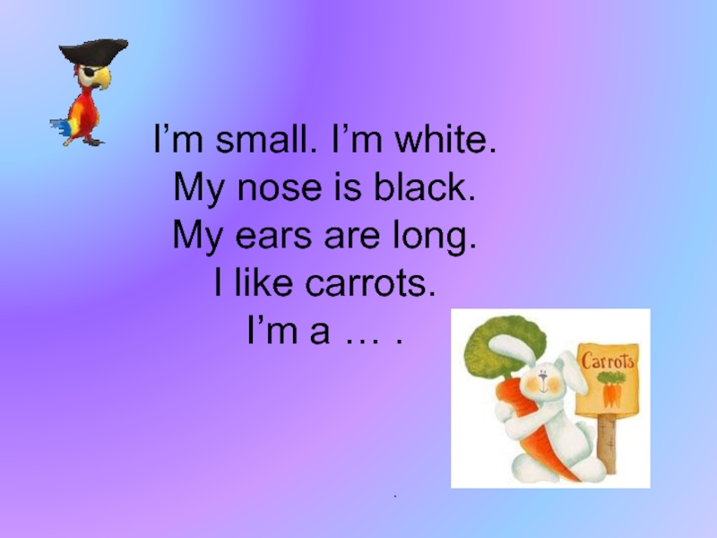 .I’m small. I’m white. My nose is black. My ears are long. I like carrots. I’m a
