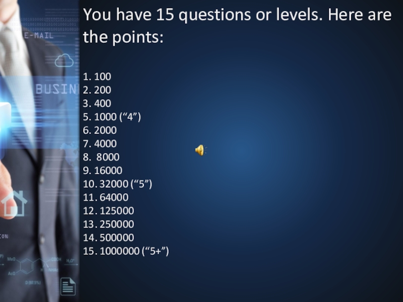 Слайд 2You have 15 questions or levels. Here are the points: 1. 100 2.