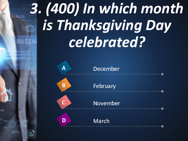 Слайд 93. (400) In which month is Thanksgiving Day celebrated?