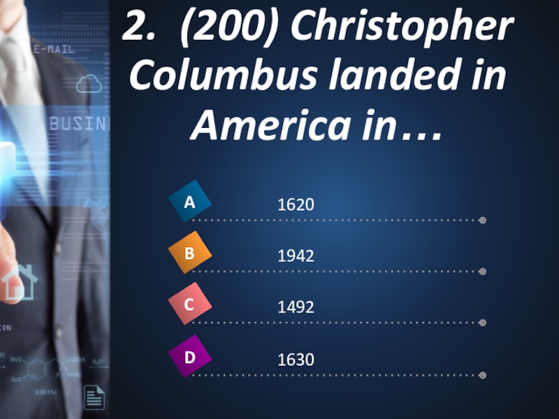Слайд 72. (200) Christopher Columbus landed in America in…