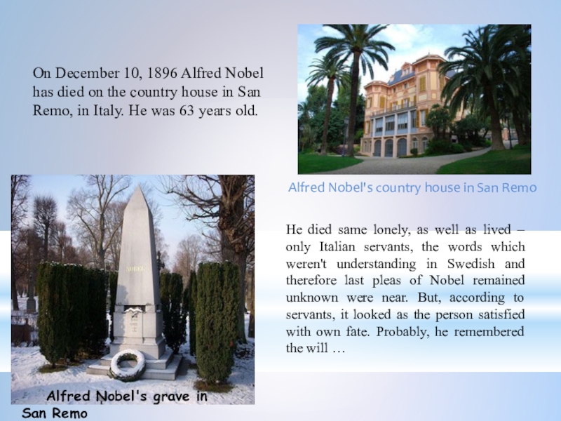 He died same lonely, as well as lived – only Italian servants, the words which weren't understanding in Swedish and therefore last pleas of Nobel remained unknown were near. But, according to servants, it looked as the person satisfied with own fate. Probably, he remembered the will …