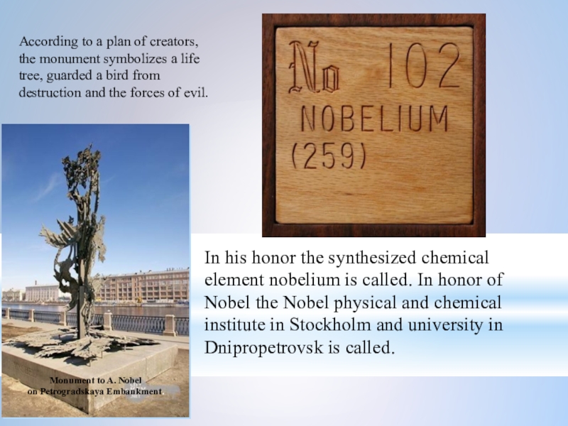 In his honor the synthesized chemical element nobelium is called. In honor of Nobel the Nobel physical and chemical institute in Stockholm and university in Dnipropetrovsk is called.