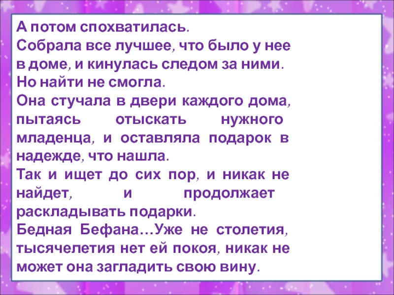 Бедная Бефана…Уже не столетия, тысячелетия нет ей покоя, никак не может она загладить свою вину.