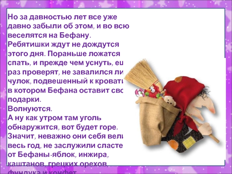 во всю веселятся на Бефану. Ребятишки ждут не дождутся этого дня. Пораньше ложатся спать, и прежде чем уснуть, еще раз проверят, не завалился ли чулок, подвешенный к кровати, в котором Бефана оставит свои подарки.