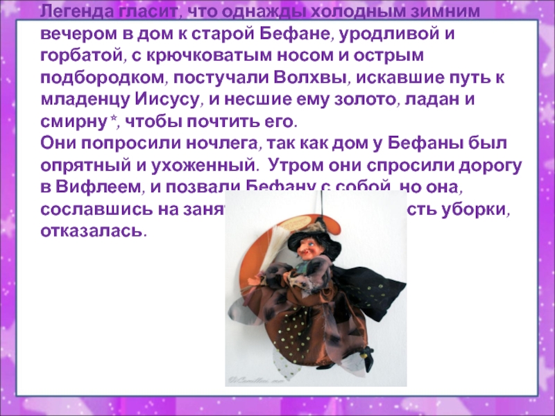Легенда гласит, что однажды холодным зимним вечером в дом к старой Бефане, уродливой и горбатой, с крючковатым носом и острым подбородком, постучали Волхвы, искавшие путь к младенцу Иисусу, и несшие ему золото, ладан и смирну*, чтобы