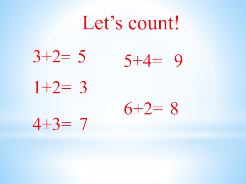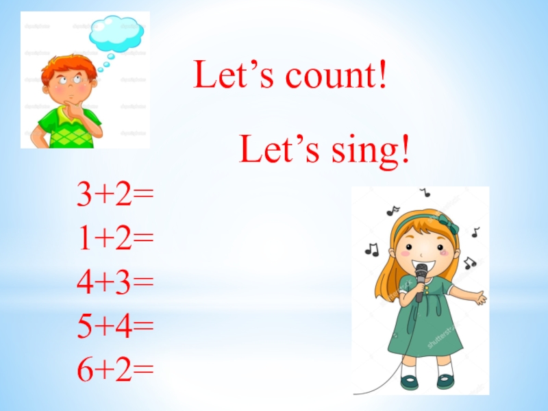 Let’s count!3+2=1+2=4+3=5+4=6+2=Let’s sing!