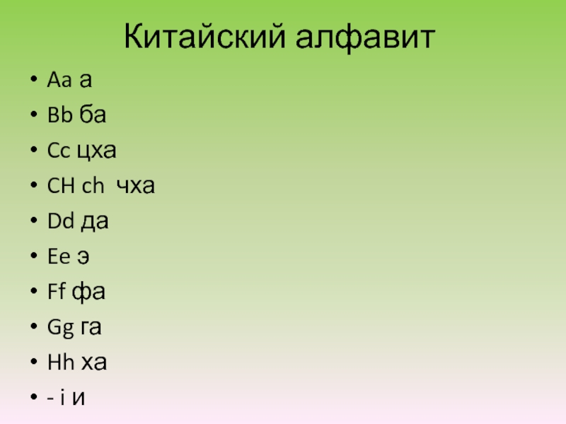 Китайский алфавитAa аBb баCc цхаCH ch чхаDd даEe эFf фаGg гаHh ха- i иJj цзиKk кхаLl лаMm