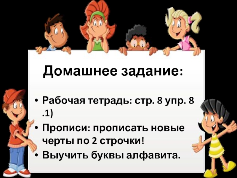 Домашнее задание:Рабочая тетрадь: стр. 8 упр. 8 .1)Прописи: прописать новые черты по 2 строчки!Выучить буквы алфавита.