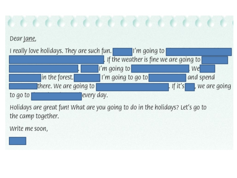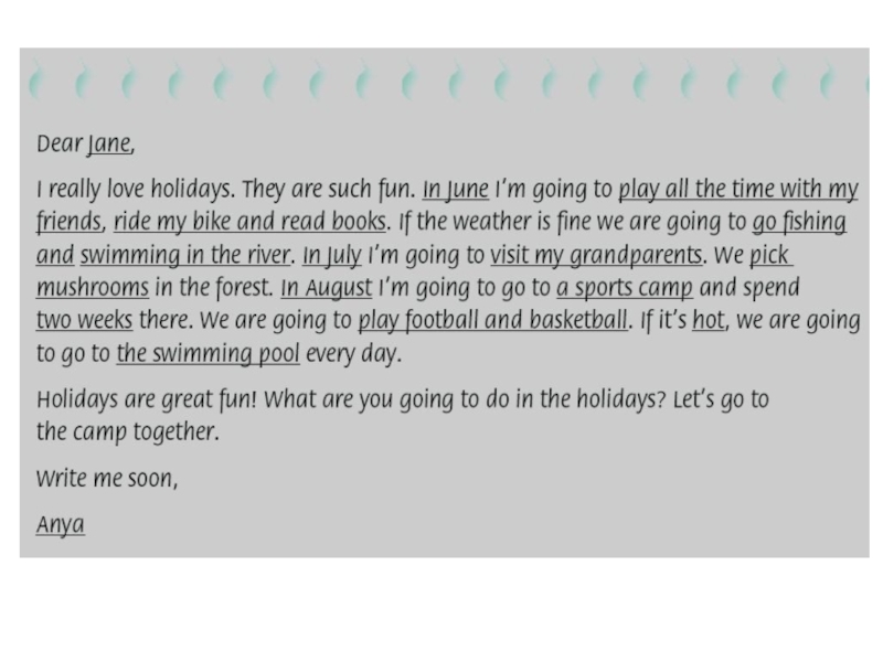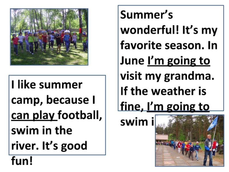 Summer’s wonderful! It’s my favorite season. In June I’m going to visit my grandma. If the weather is fine, I’m going to swim in the river.