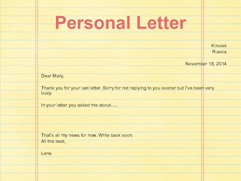 Personal LetterKirovskRussiaNovember 18, 2014Dear Mary,Thank you for your last letter. Sorry for not replying to you sooner