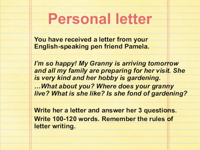 Personal letterYou have received a letter from your English-speaking pen friend Pamela.I’m so happy! My Granny is