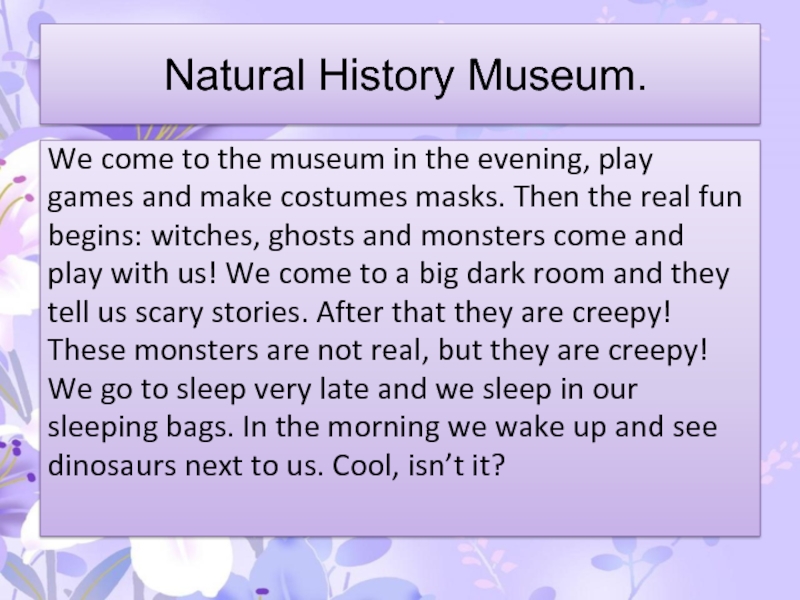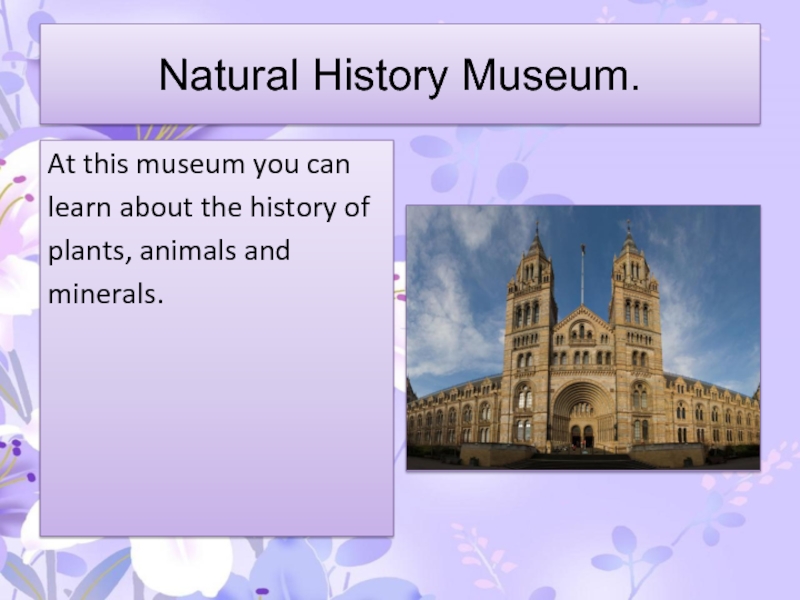 Natural History Museum. At this museum you can learn about the history of plants, animals and