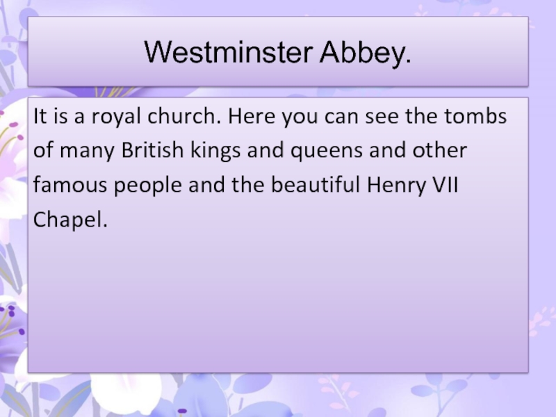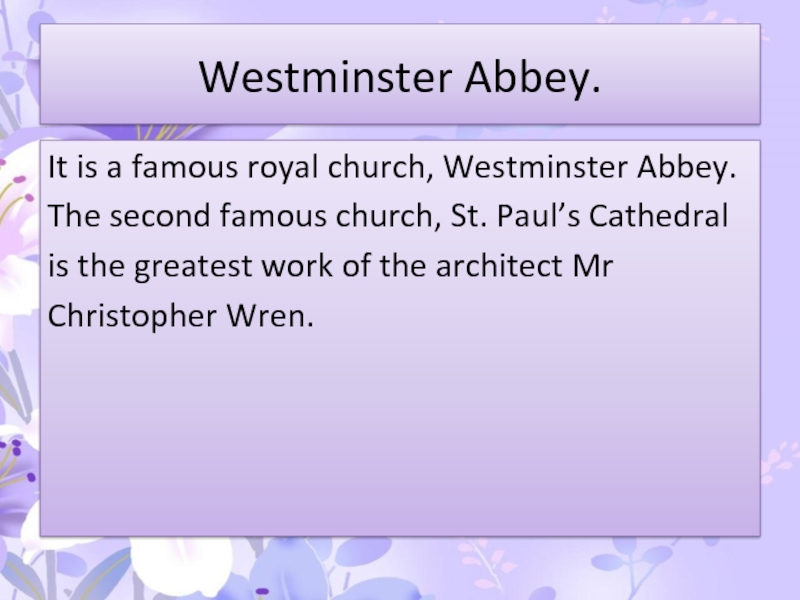 Westminster Abbey.It is a famous royal church, Westminster Abbey. The second famous church, St. Paul’s Cathedral is