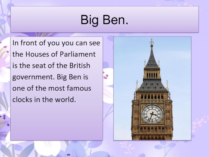 Big Ben.In front of you you can see the Houses of Parliament is the seat of the