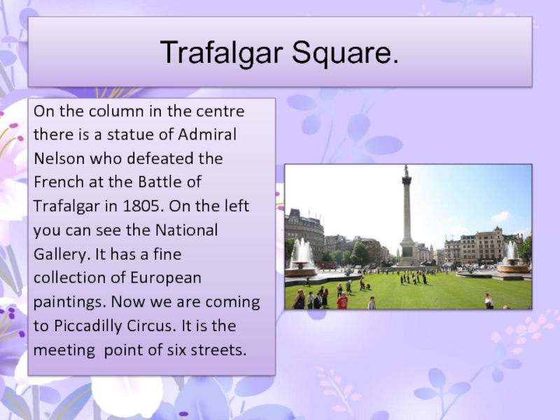 Trafalgar Square.On the column in the centre there is a statue of Admiral Nelson who defeated the