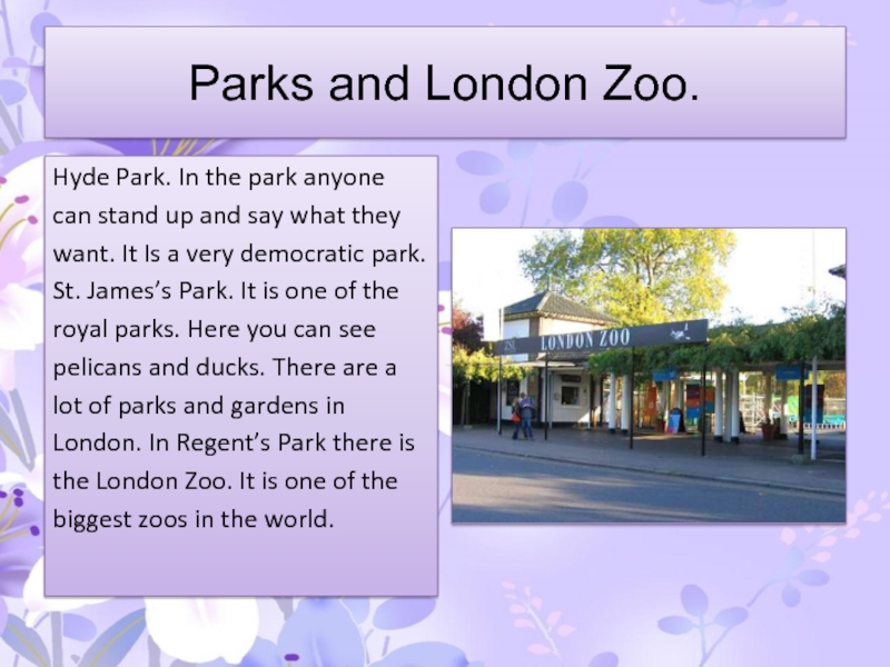 Parks and London Zoo.Hyde Park. In the park anyonecan stand up and say what they want. It