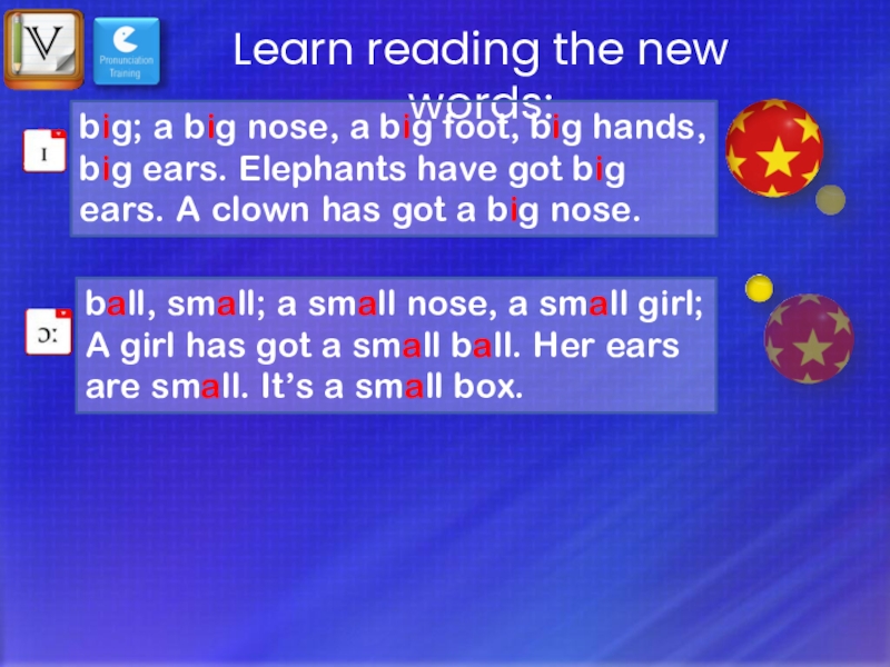 ball, small; a small nose, a small girl; A girl has got a small ball. Her ears are small. It’s a small box.