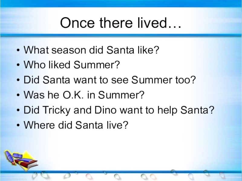 Once there lived…What season did Santa like?Who liked Summer?Did Santa want to see Summer too?Was he O.K.