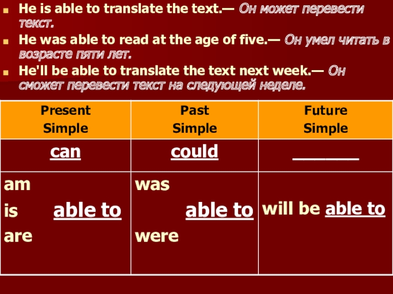 Не can play tennis.— Он умеет играть в теннис.
