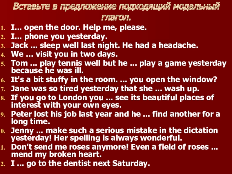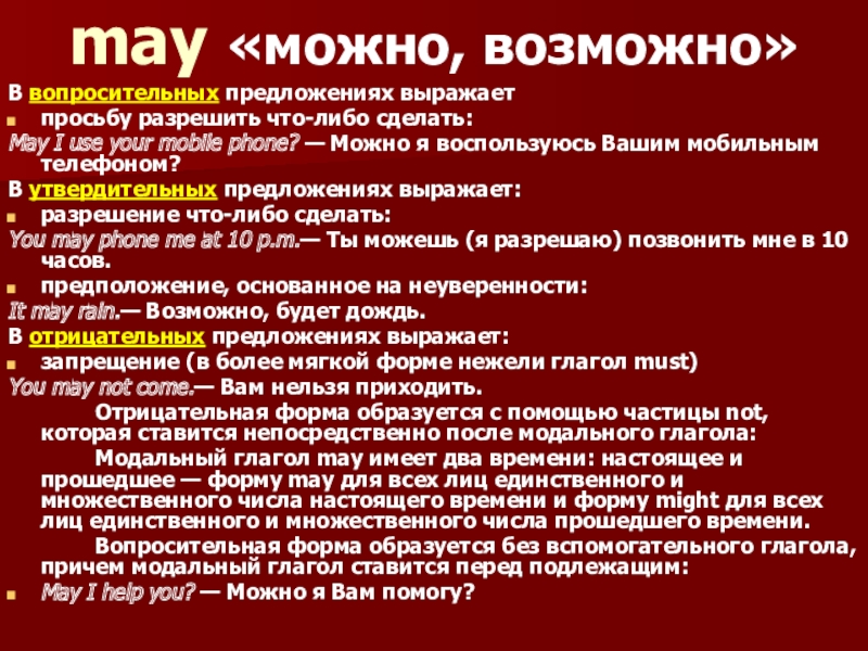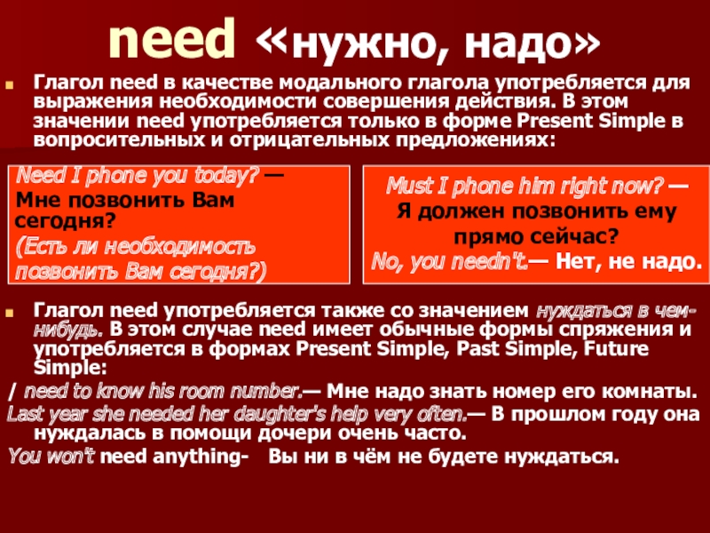 К модальным глаголам относятся глаголы can, must, should, may, need. Они обозначают возможность, способность, вероятность, необходимость совершения действия, выраженного основным глаголом.