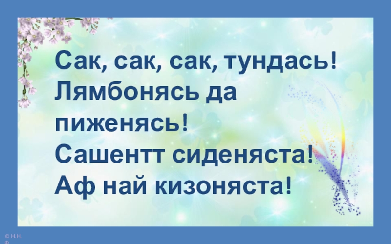 Сак, сак, сак, тундась!Лямбонясь да пиженясь!Сашентт сиденяста!Аф най кизоняста!