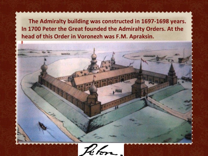 In 1700 Peter the Great founded the Admiralty Orders. At the head of this Order in Voronezh was F.M. Apraksin.