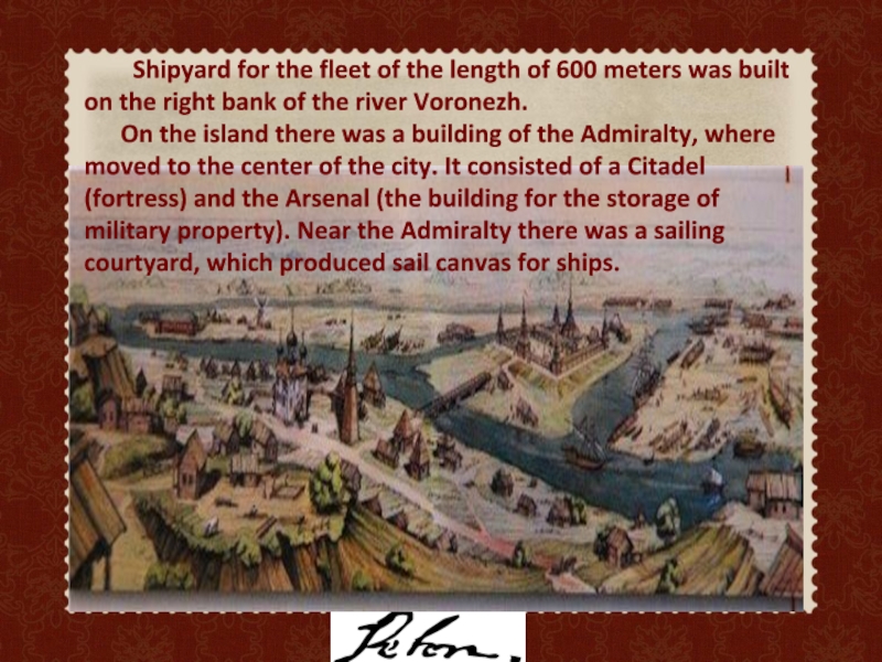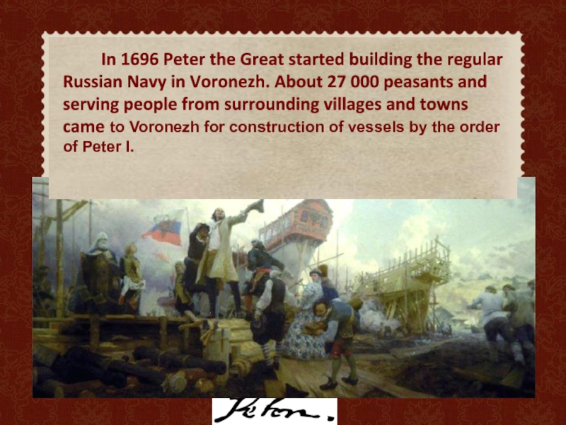 building the regular Russian Navy in Voronezh. About 27 000 peasants and serving people from surrounding villages and towns came to Voronezh for construction of vessels by the order of Peter I.