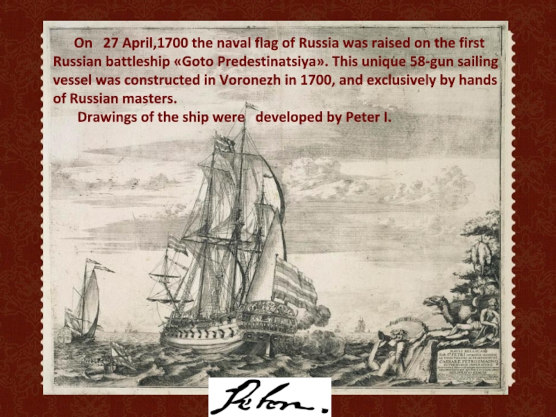 On  27 April,1700 the naval flag of Russia was raised on the first