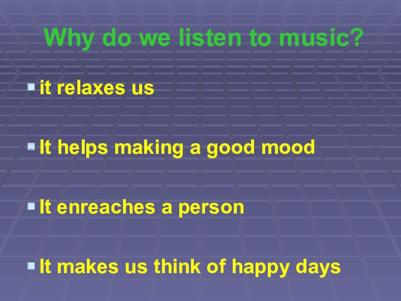 Why do we listen to music?it relaxes usIt helps making a good moodIt enreaches a personIt makes