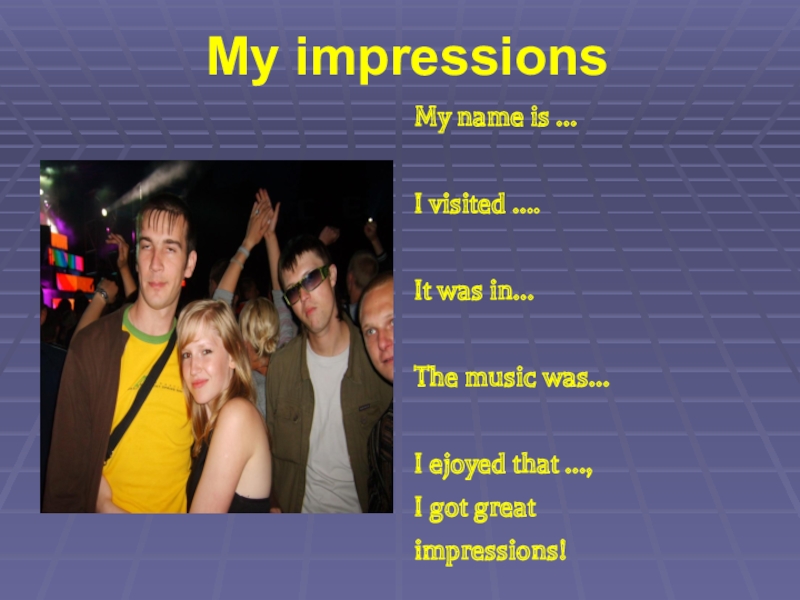 My impressionsMy name is …I visited ….It was in…The music was…I ejoyed that …,I got greatimpressions!