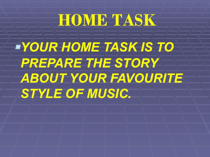 HOME TASKYOUR HOME TASK IS TO PREPARE THE STORY ABOUT YOUR FAVOURITE STYLE OF MUSIC.