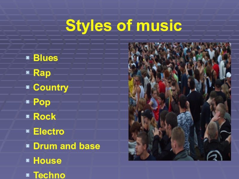 Styles of musicBluesRapCountryPopRockElectroDrum and baseHouseTechno