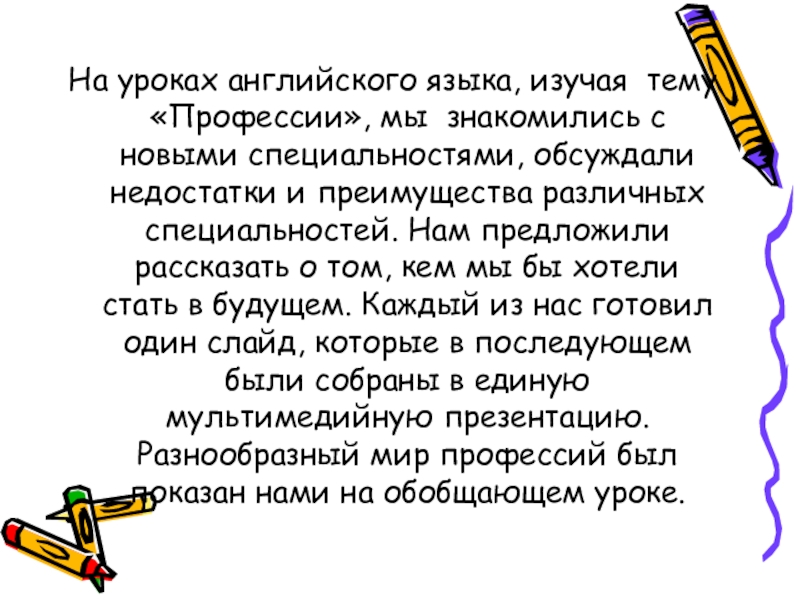Это сайт презентаций, где можно хранить и обмениваться своими презентациями, докладами, проектами, шаблонами в формате PowerPoint с другими пользователями. Мы помогаем школьникам, студентам, учителям, преподавателям хранить и обмениваться учебными материалами.