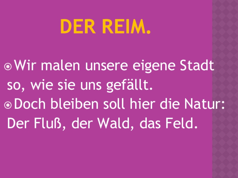 Der Reim.Wir malen unsere eigene Stadtso, wie sie uns gefällt.Doch bleiben soll hier die Natur:Der Fluß, der