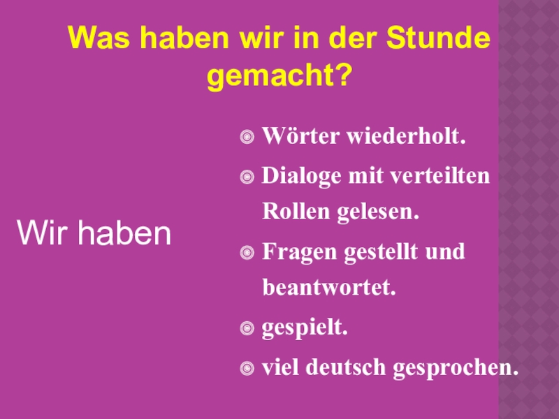 Was haben wir in der Stunde gemacht?Wir habenWörter wiederholt.Dialoge mit verteilten Rollen gelesen.Fragen gestellt und beantwortet.gespielt.viel deutsch