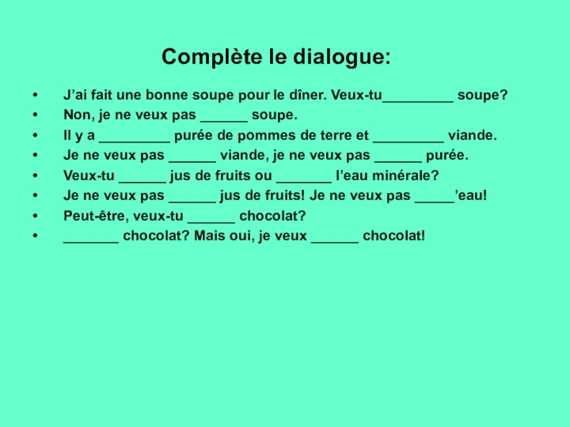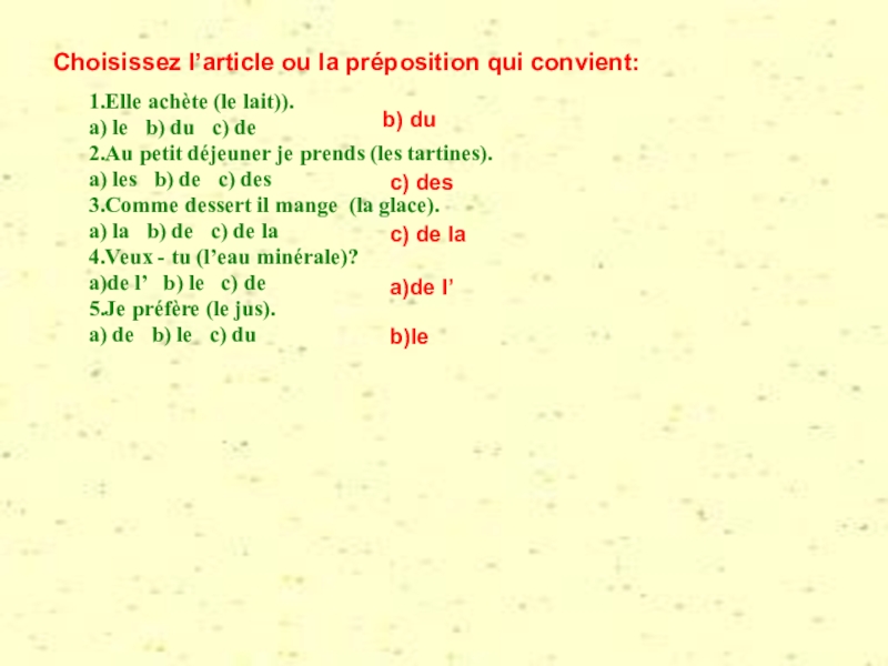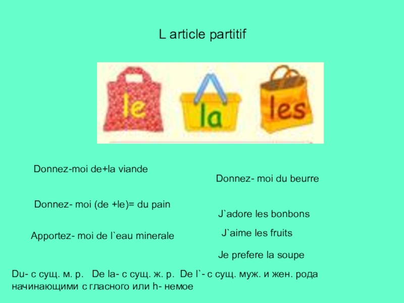 Du- c cущ. м. р. De la- с сущ. ж. р. De l`- c сущ. муж. и жен. рода начинающими с гласного или h- немое