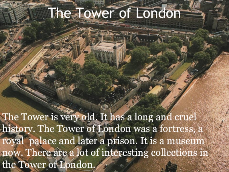 long and cruel history. The Tower of London was a fortress, a royal palace and later a prison. It is a museum now. There are a lot of interesting collections in the Tower of London.