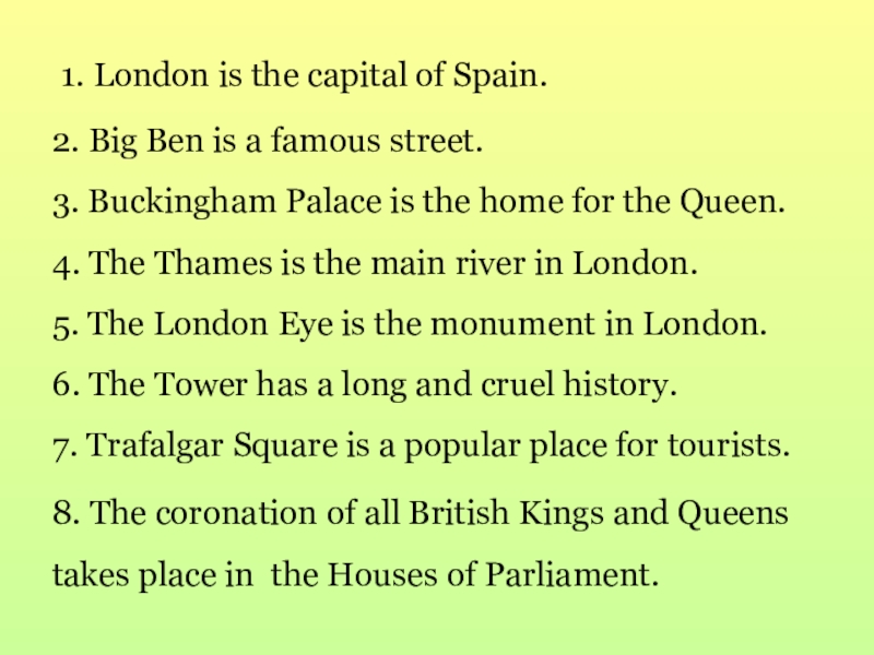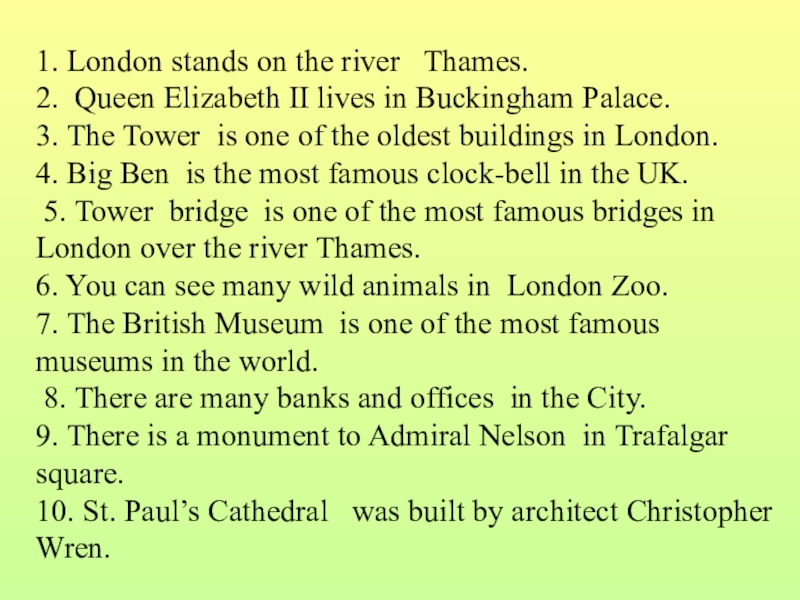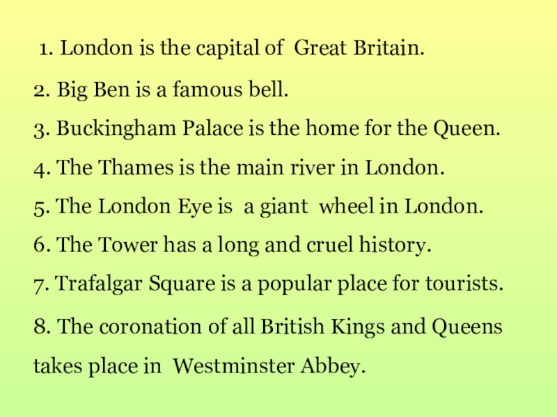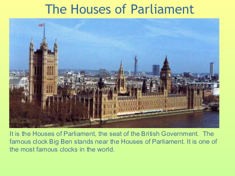 seat of the British Government. The famous clock Big Ben stands near the Houses of Parliament. It is one of the most famous clocks in the world.