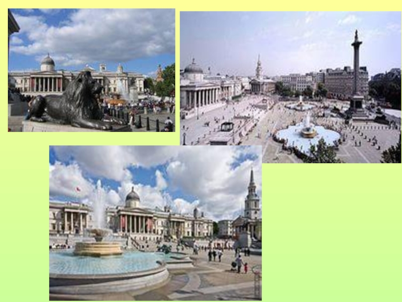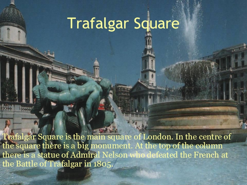 centre of the square there is a big monument. At the top of the column there is a statue of Admiral Nelson who defeated the French at the Battle of Trafalgar in 1805.