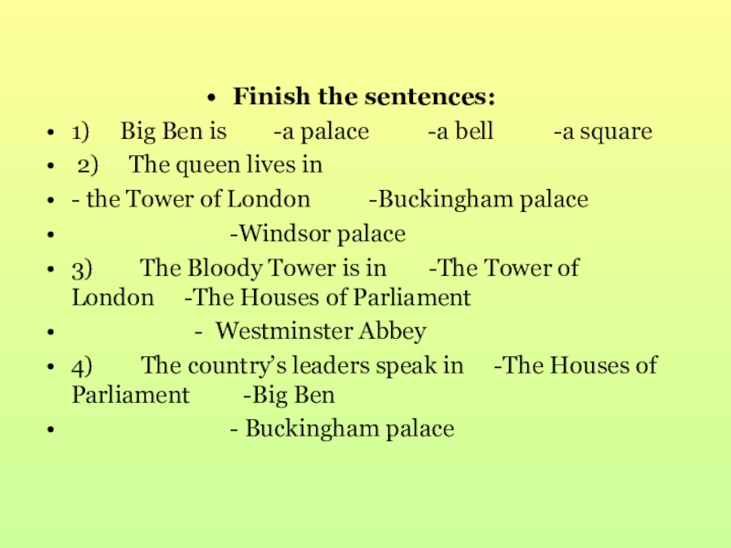 3) The Bloody Tower is in -The Tower of London -The Houses of Parliament