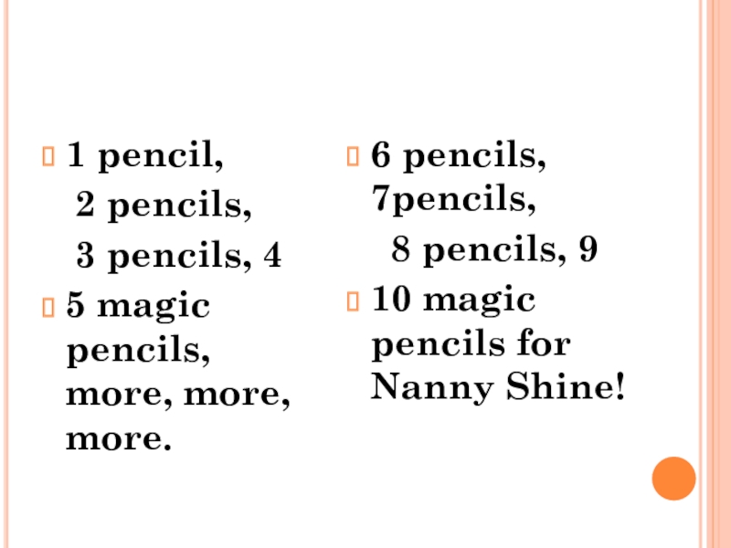 1 pencil, 2 pencils, 3 pencils, 45 magic pencils, more, more, more.6 pencils, 7pencils, 8 pencils, 910 magic pencils for Nanny Shine!
