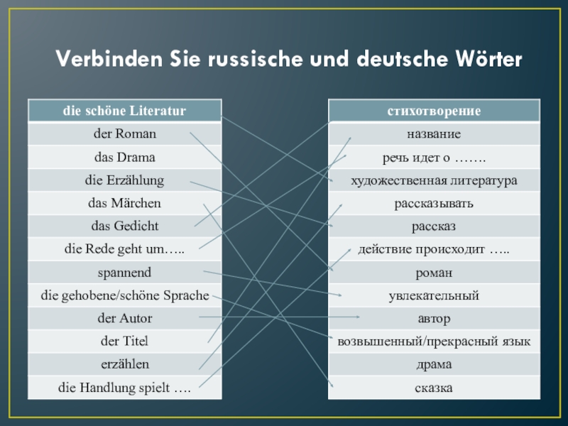 Слайд 3Verbinden Sie russische und deutsche Wörter