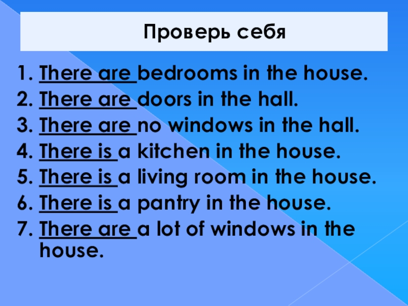 Проверь себя1. There are bedrooms in the house.2. There are doors in the hall.3. There are no