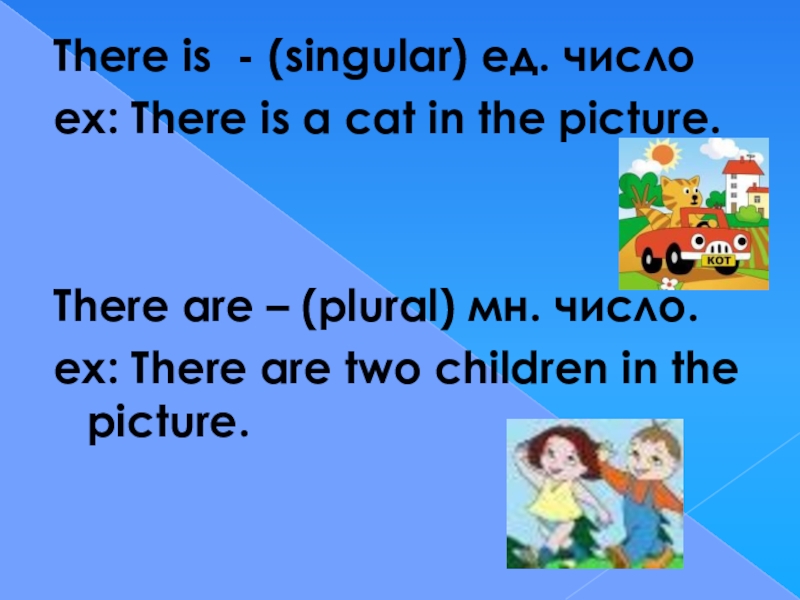There is - (singular) ед. числоex: There is a cat in the picture. There are – (plural)