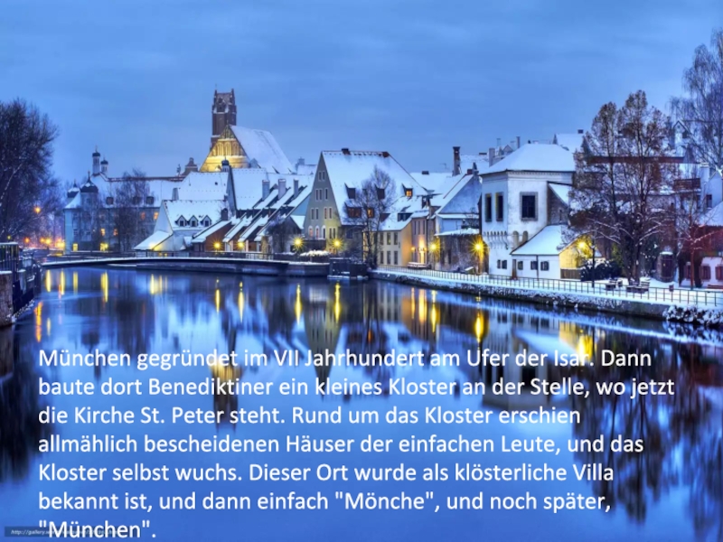 München gegründet im VII Jahrhundert am Ufer der Isar. Dann baute dort Benediktiner ein kleines Kloster an