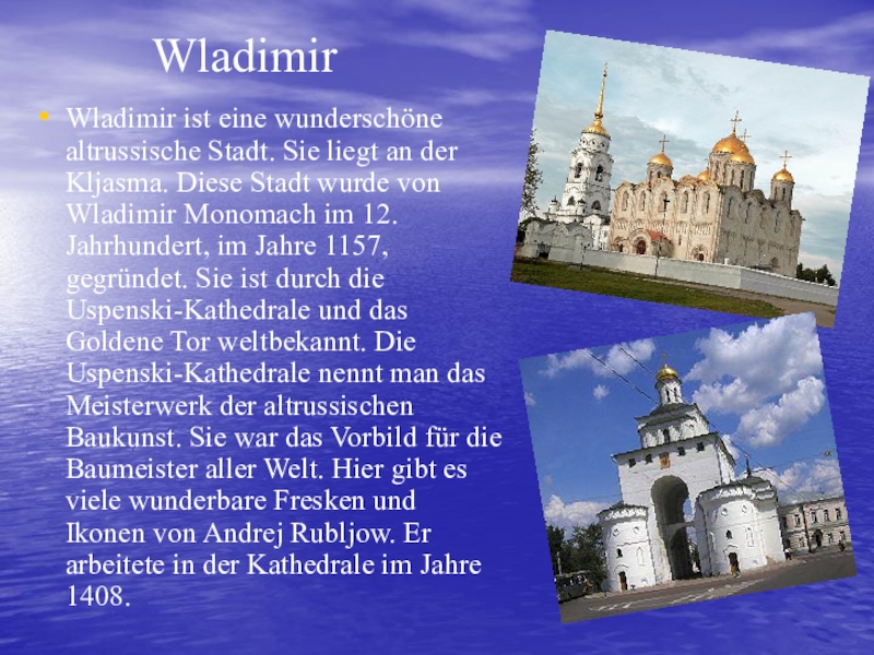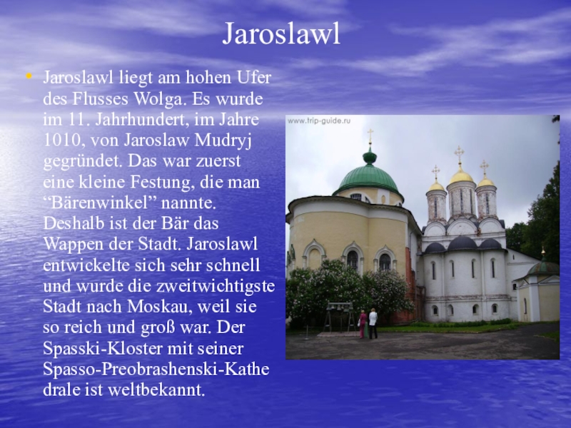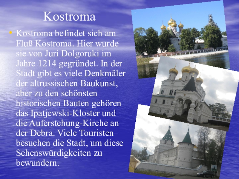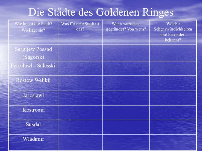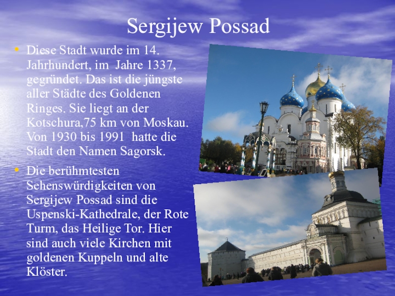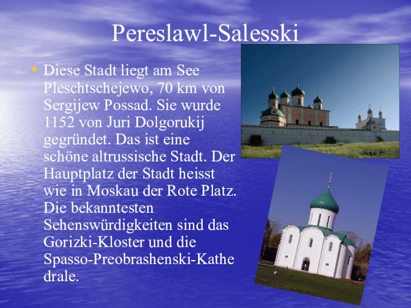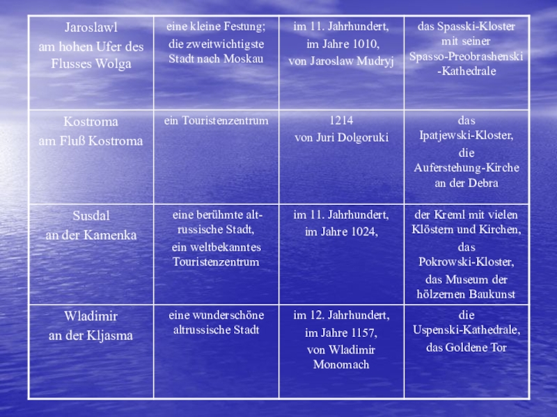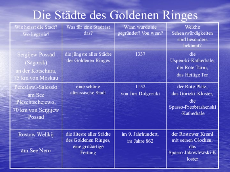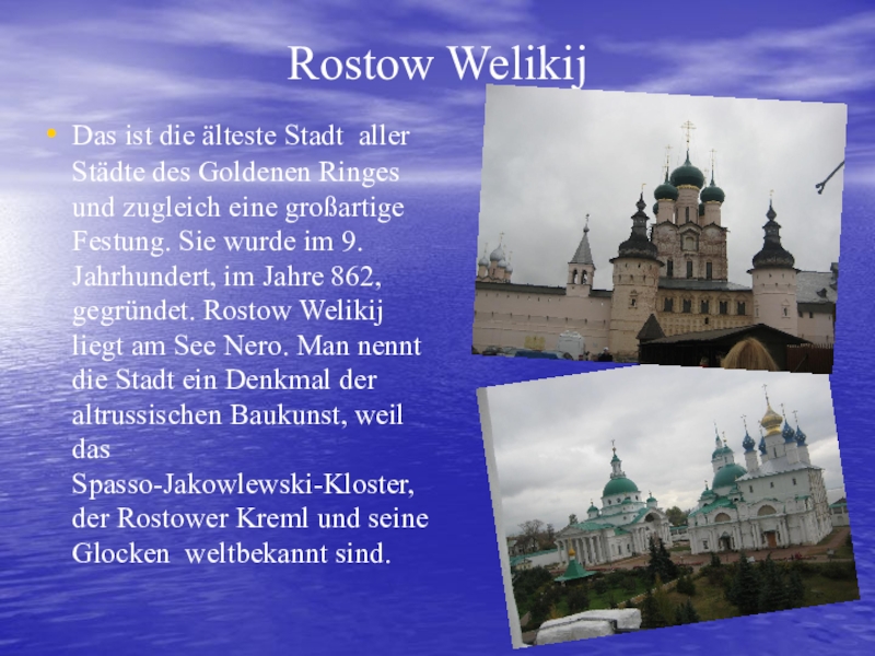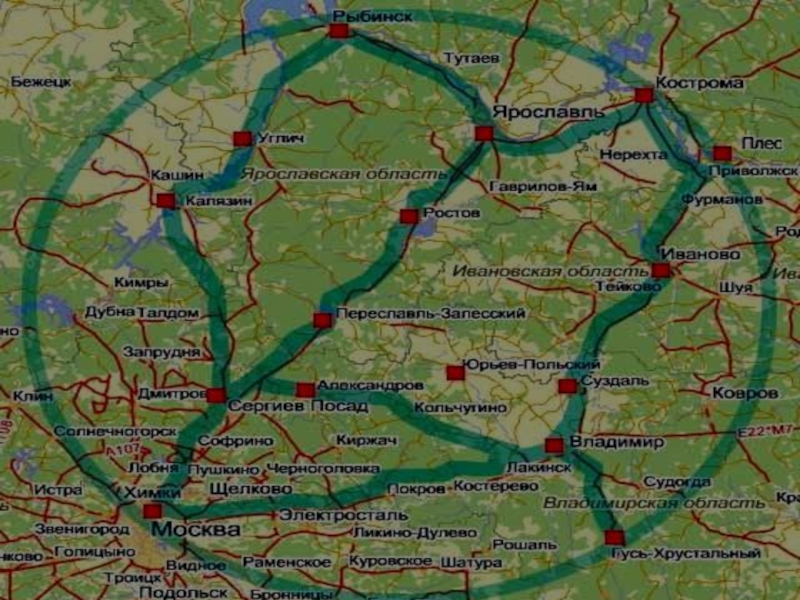 liegen rund um Moskau. Das sind Sergijew Possad, Pereslawl-Salesski, Rostow Welikij, Jaroslawl, Kostroma, Susdal, Wladimir und noch einige kleine Städtchen.