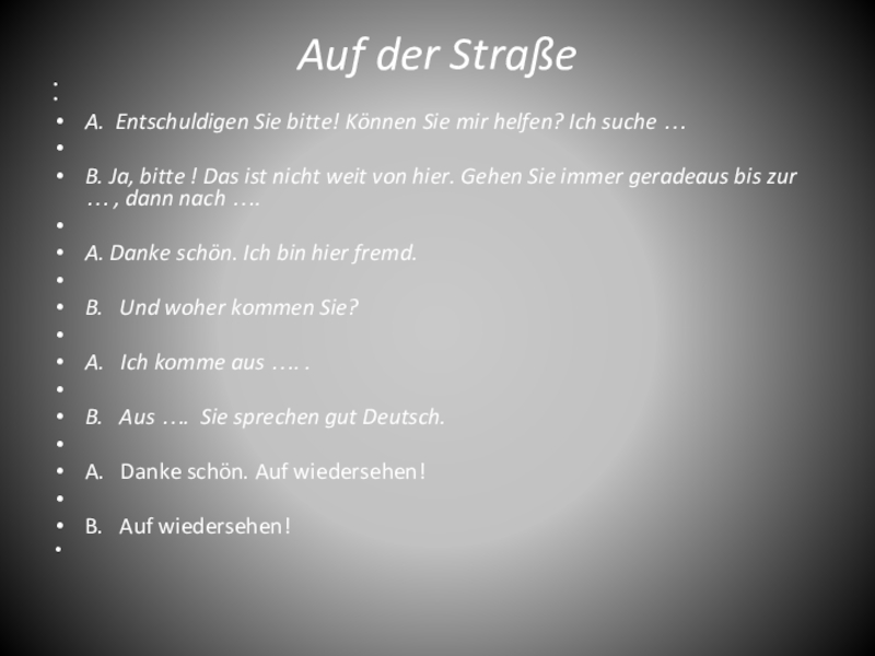 Auf der Straße   A. Entschuldigen Sie bitte! Können Sie mir helfen? Ich suche … B. Ja, bitte !
