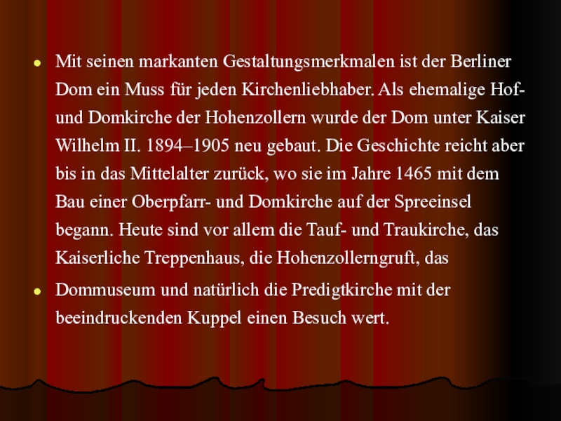 jeden Kirchenliebhaber. Als ehemalige Hof- und Domkirche der Hohenzollern wurde der Dom unter Kaiser Wilhelm II. 1894–1905 neu gebaut. Die Geschichte reicht aber bis in das Mittelalter zurück, wo sie im Jahre 1465 mit dem Bau einer Oberpfarr- und Domkirche auf der Spreeinsel begann. Heute sind vor allem die Tauf- und Traukirche, das Kaiserliche Treppenhaus, die Hohenzollerngruft, das