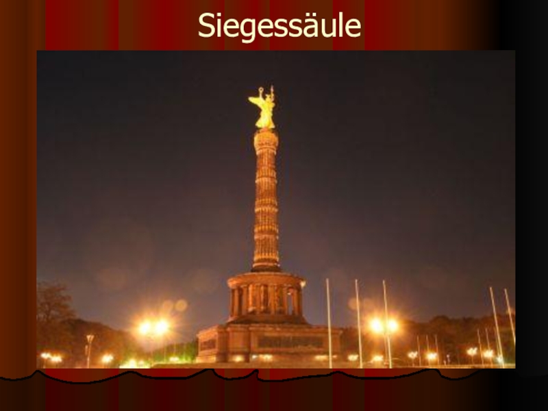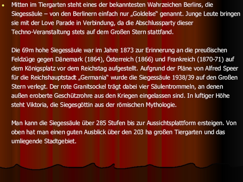 Слайд 12Mitten im Tiergarten steht eines der bekanntesten Wahrzeichen Berlins, die Siegessäule